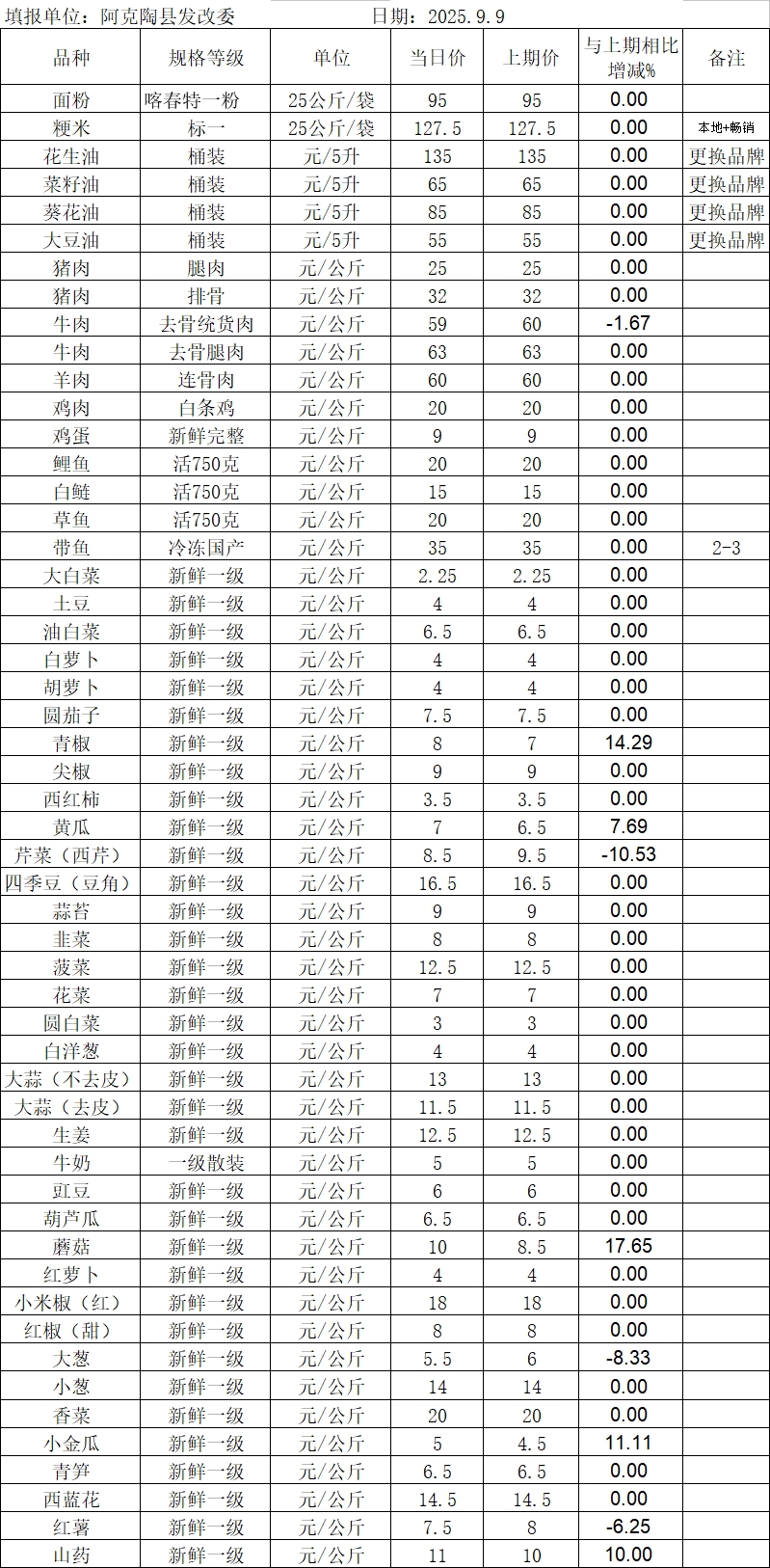 2025年9月9日阿克陶县肉、禽、蛋、菜、水产品价格监测表