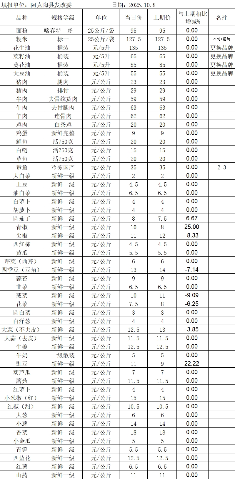 2025年10月8日阿克陶县肉、禽、蛋、菜、水产品价格监测表