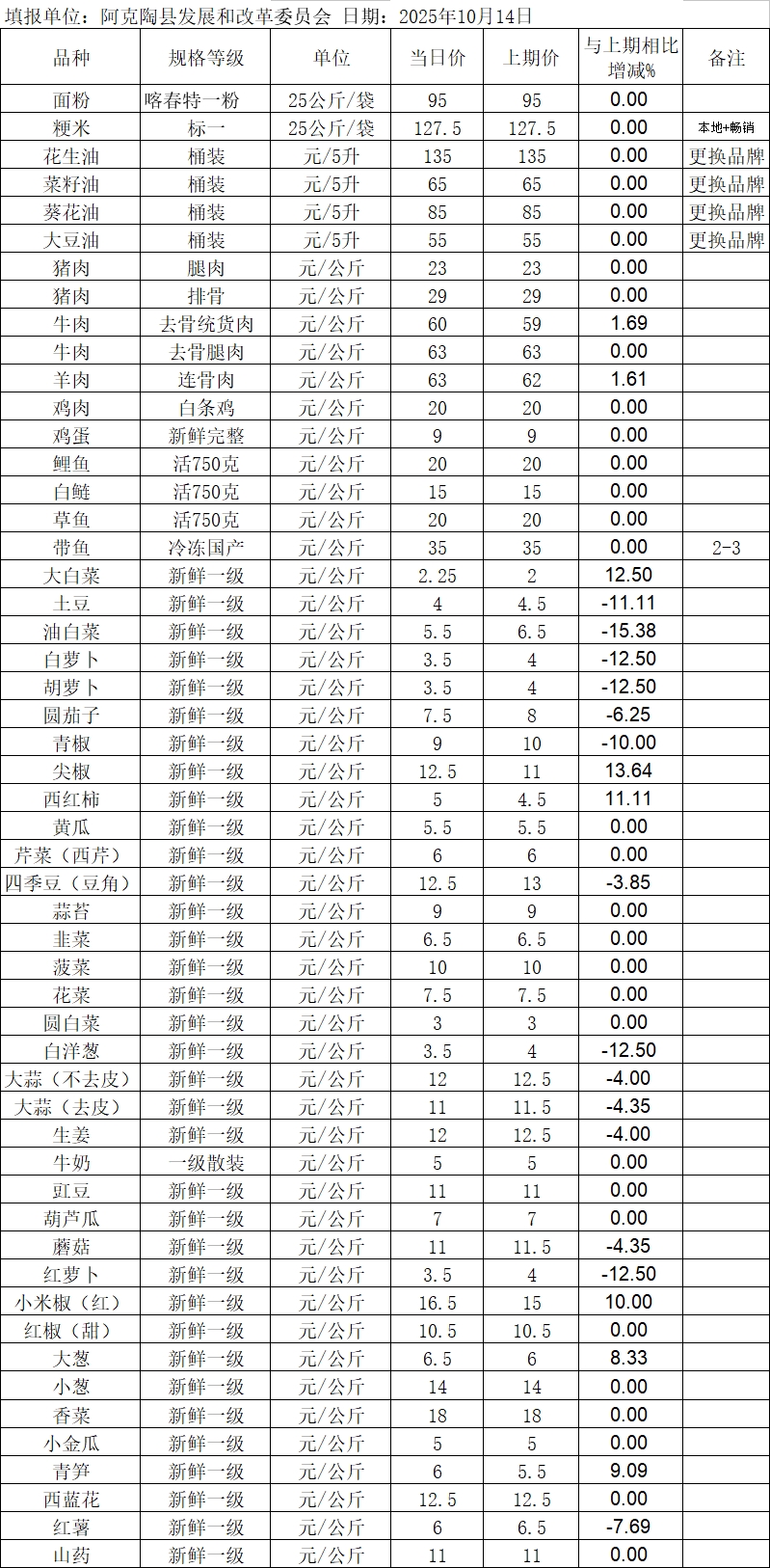 2025年10月14日阿克陶县肉、禽、蛋、菜、水产品价格监测表