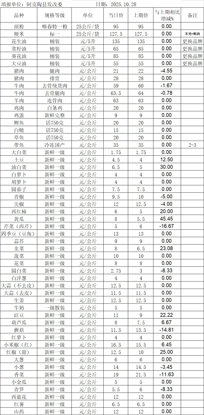 2025年10月28日阿克陶县肉、禽、蛋、菜、水产品价格监测表