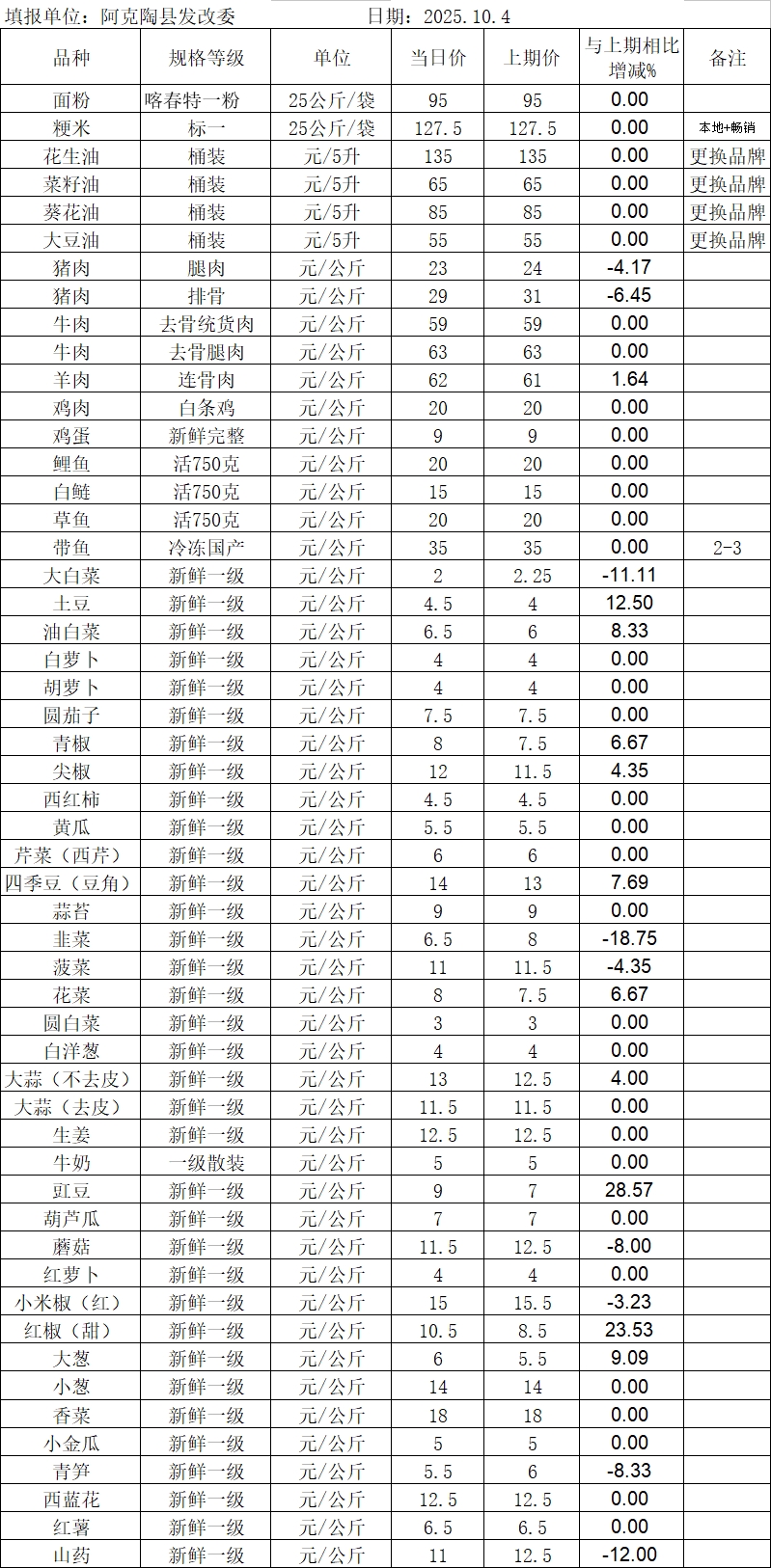 2025年10月4日阿克陶县肉、禽、蛋、菜、水产品价格监测表