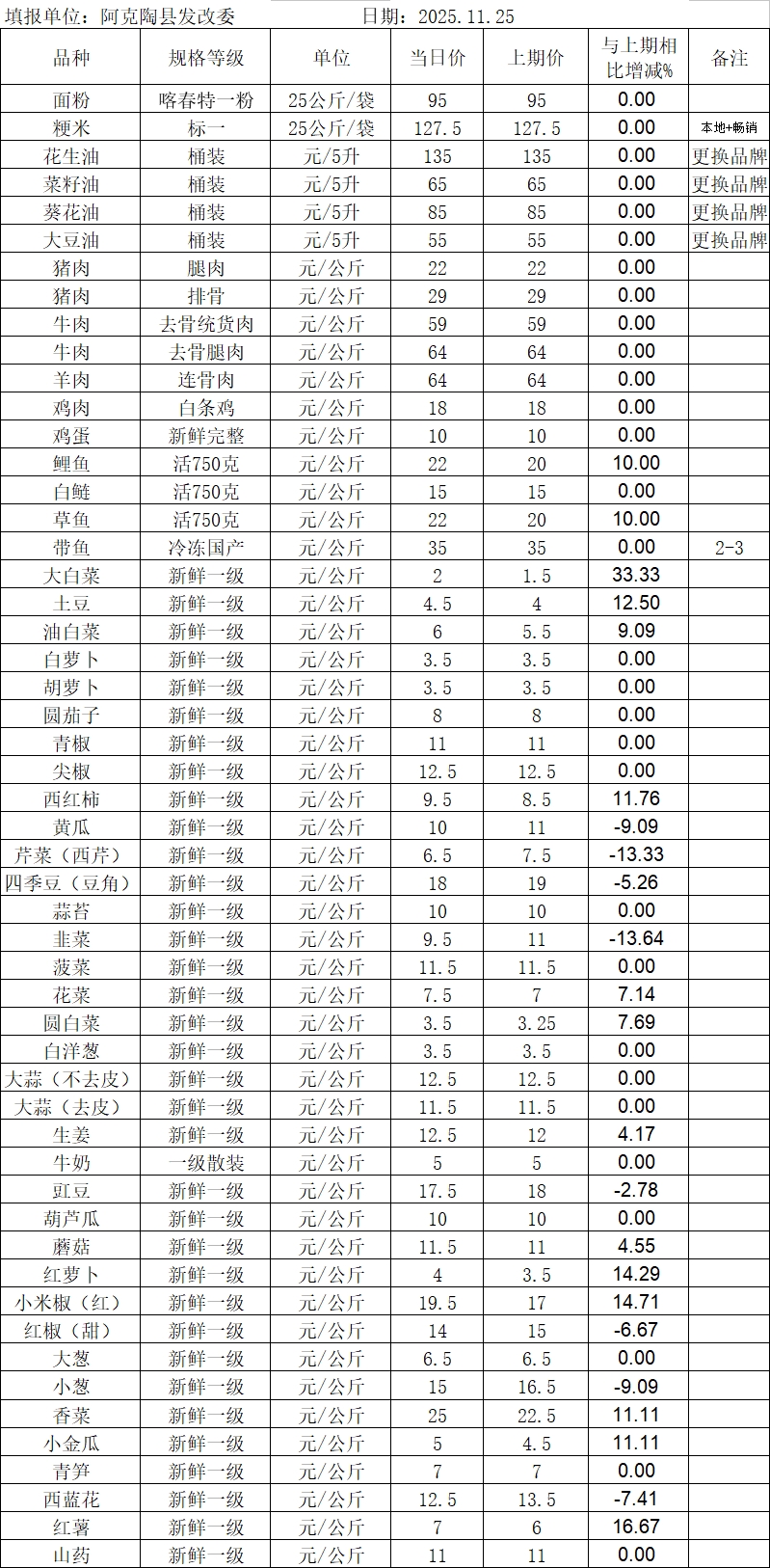 2025年11月25日阿克陶县肉、禽、蛋、菜、水产品价格监测表