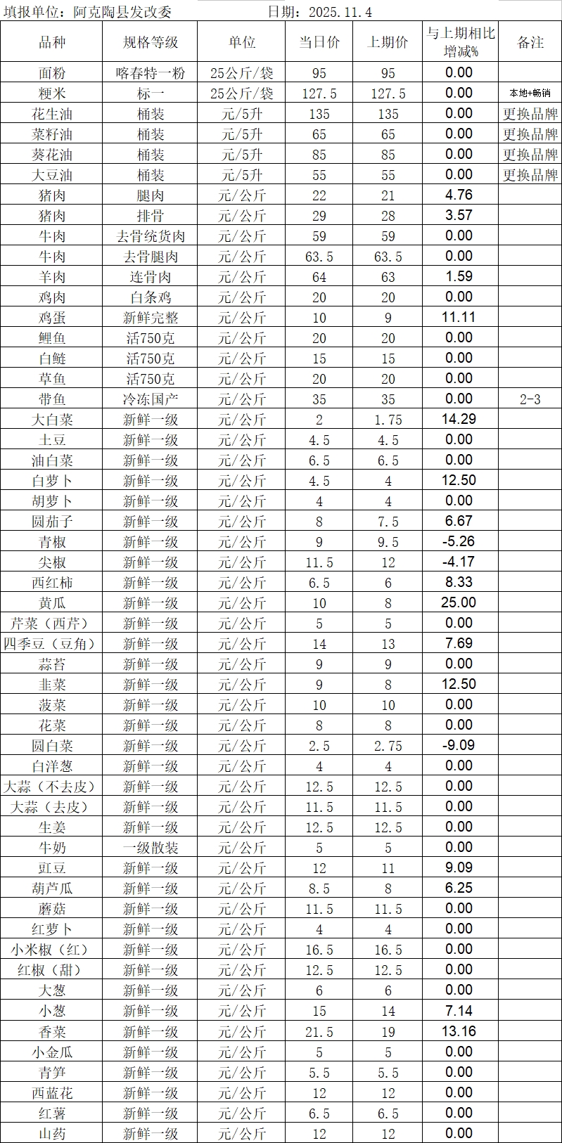 2025年11月4日阿克陶县肉、禽、蛋、菜、水产品价格监测表
