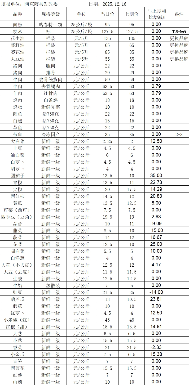 2025年12月16日阿克陶县肉、禽、蛋、菜、水产品价格监测表
