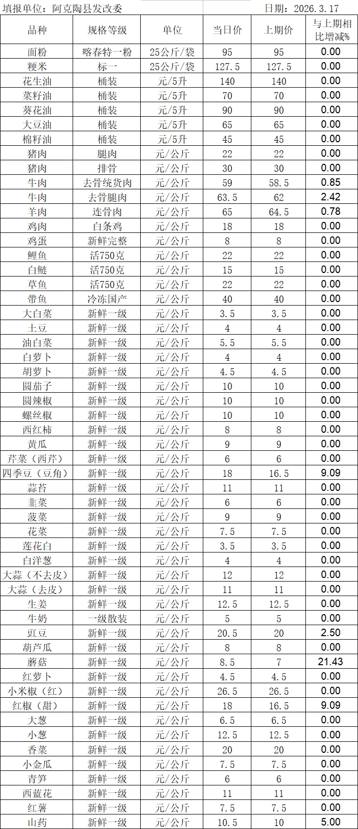 2026年3月17日阿克陶县肉、禽、蛋、菜、水产品价格监测表