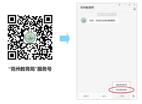 学生填报启动后,学生通过克州教育局的微信服务号底部菜单进入报名小程序: