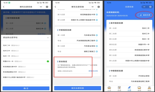 第二步:填报志愿,必须填写8个不同的普高,2个不同的中职学校,10个志愿都必须填写,志愿选择完成后,志愿不得重复或漏报,在提交时需再次校验短信验证码,提交后等待志愿审核与录取,在可填报时间段内,可随时查看已提交的志愿或点击“编辑志愿”进行修改。