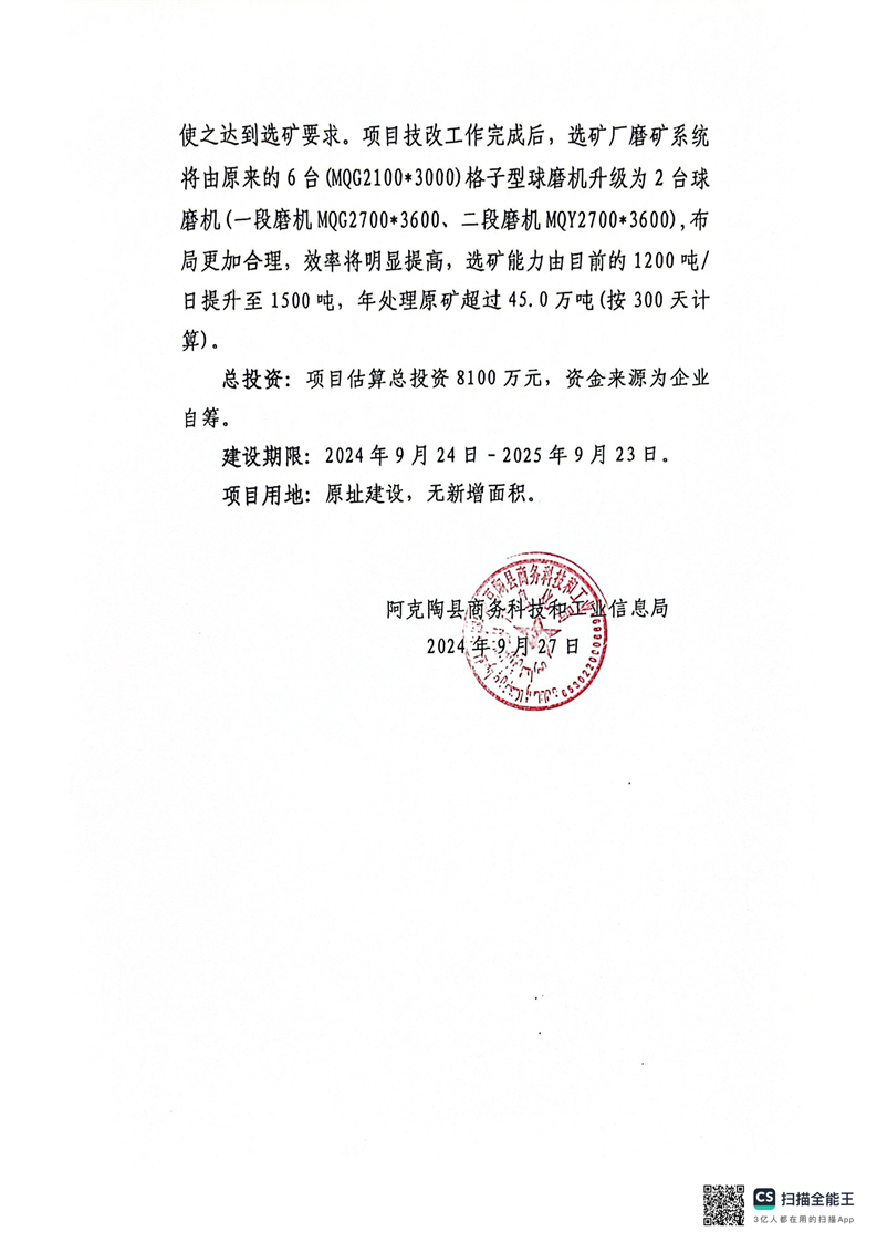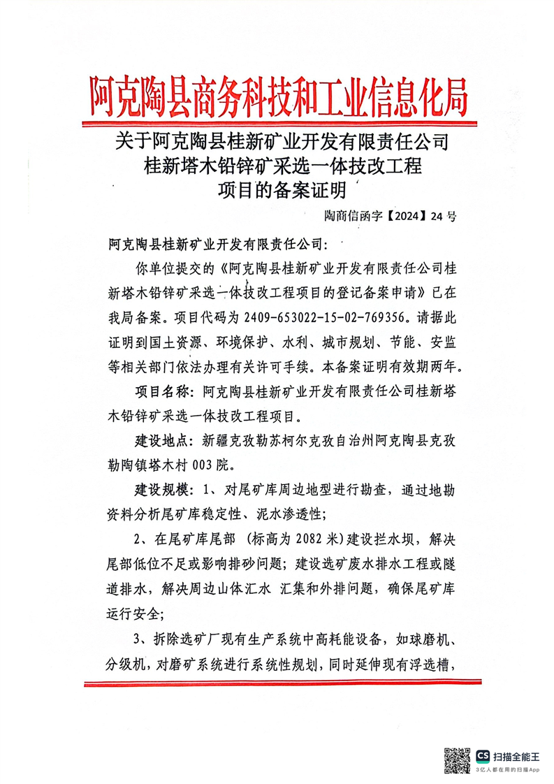 关于阿克陶县桂新矿业开发有限责任公司桂新塔木铅锌矿采选一体技改工程项目的备案证明