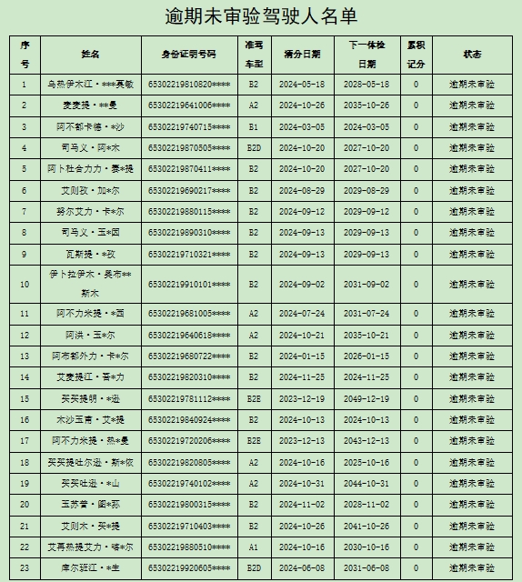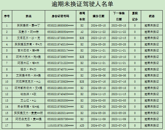 为切实强化道路交通安全,有效预防和减少道路交通事故,确保全县道路交通安全形势持续稳定向好,阿克陶县公安局交警大队车辆管理所现将辖区内逾期未审验和逾期未换证的重点驾驶人信息进行曝光,请以下驾驶人尽快到交管部门办理相关业务。(如您已办理完审验或换证业务请忽略此公告)阿克陶公安局交警大队车管所电话:0908-5721217