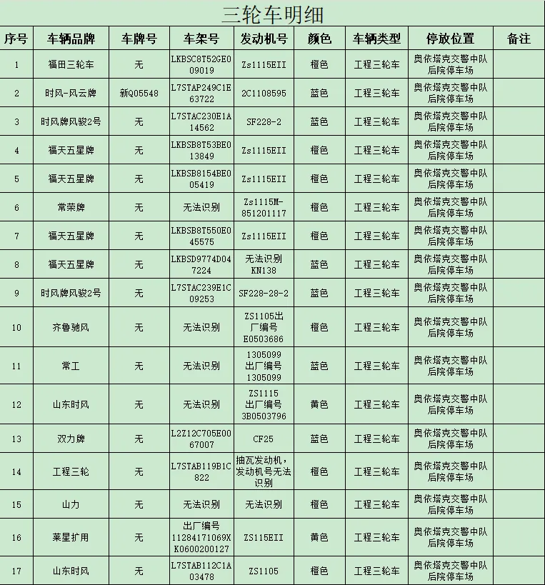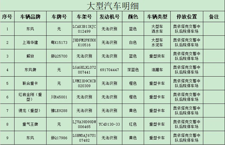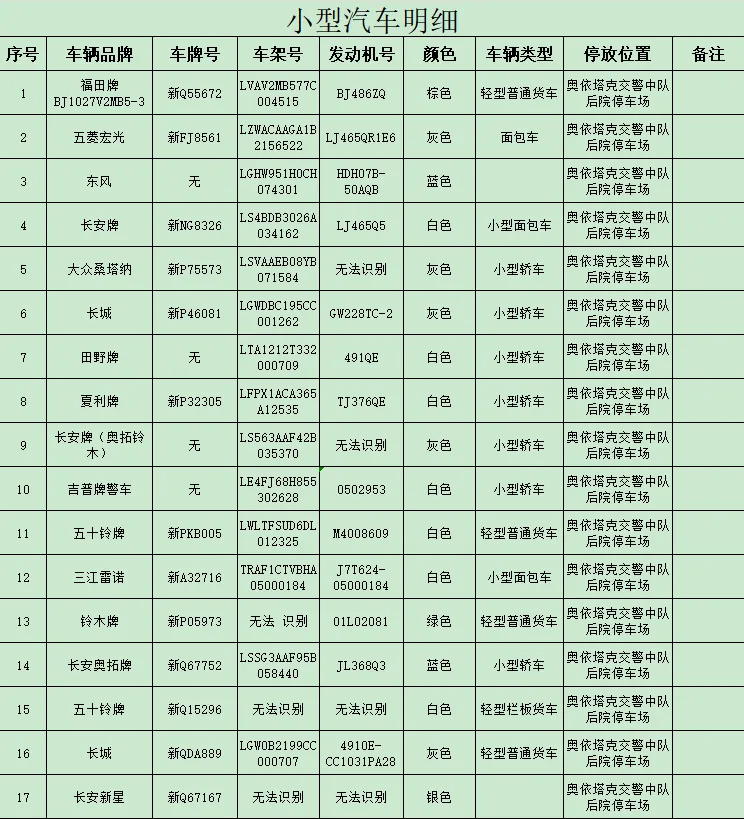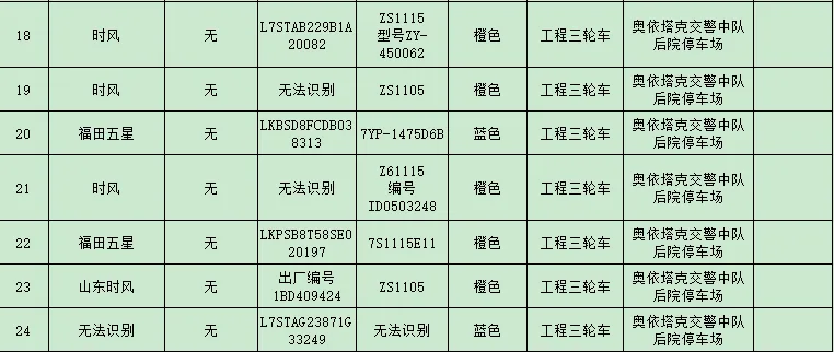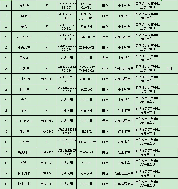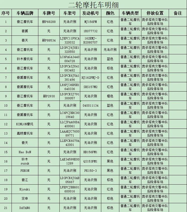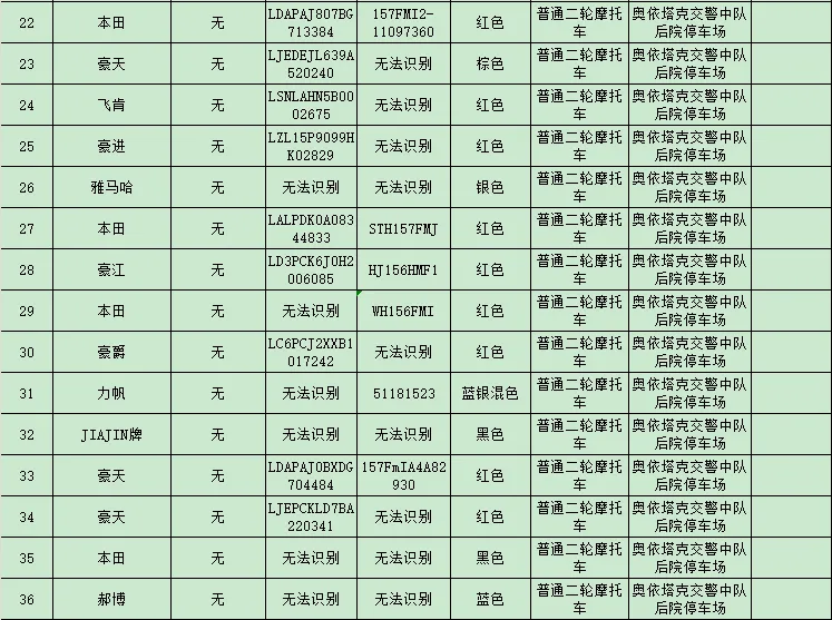 依据《中华人民共和国道路交通安全法》第一百一十二条第三款之规定,“公安机关交通管理部门扣留机动车、非机动车,应当当场出具凭证,并告知当事人在规定期限内到公安机关交通管理部门接受处理。逾期不来接受处理,并且经公告三个月仍不来接受处理的,对扣留的车辆依法处理”。现依法对104辆汽车、摩托车进行公告,请驾驶人或者所有人、管理人自公告之日起三个月内持车辆相关证件或手续到阿克陶县公安局交通警察大队接受处理,逾期不处理的将依法对公告所列车辆做拆解报废处理。