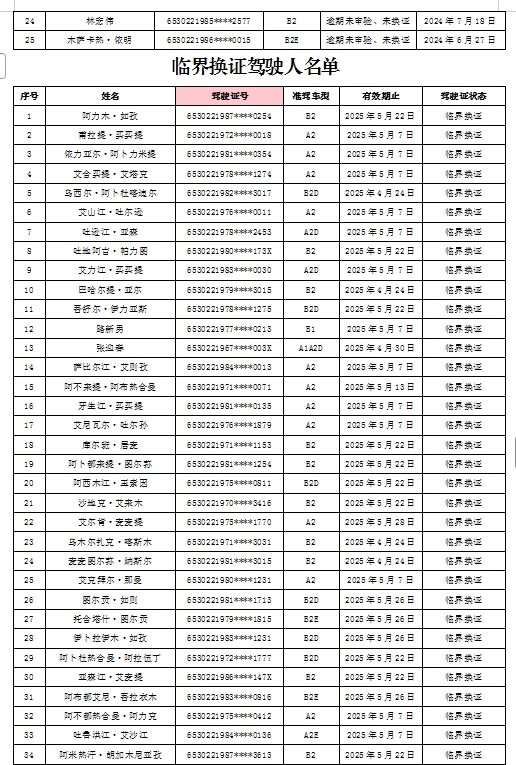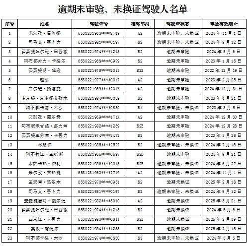 为切实强化道路交通安全,有效预防和减少道路交通事故,确保全县道路交通安全形势持续稳定向好,阿克陶县公安局交警大队车辆管理所现将辖区内逾期未审验、逾期未换证、临界换证的重点驾驶人信息进行曝光,请以下驾驶人尽快到交管部门办理相关业务。(如您已经办理完成审验或换证业务请忽略此通告)