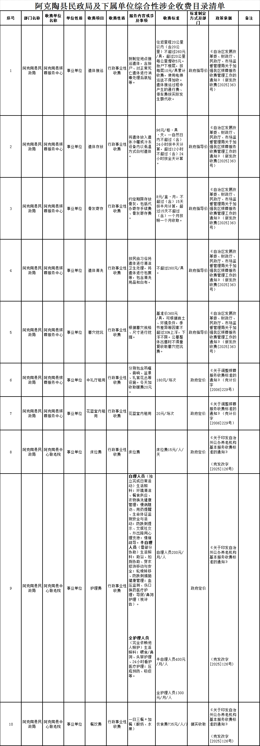 阿克陶县民政局及下属单位综合性涉企收费目录清单