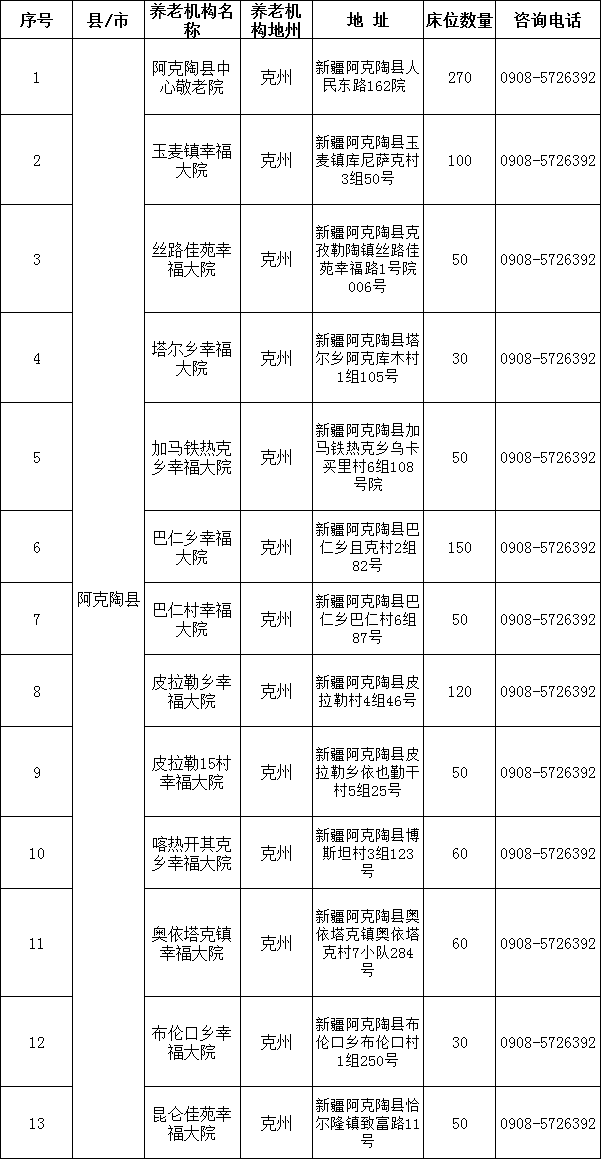 阿克陶县2024年养老机构备案信息统计表