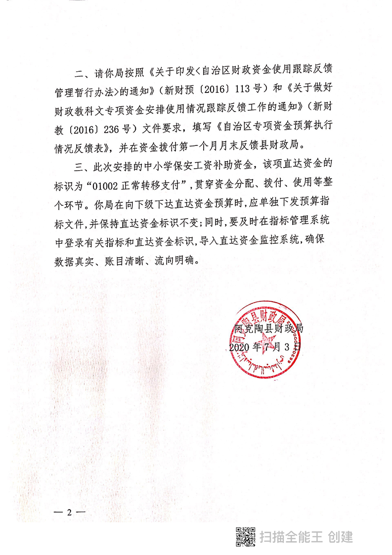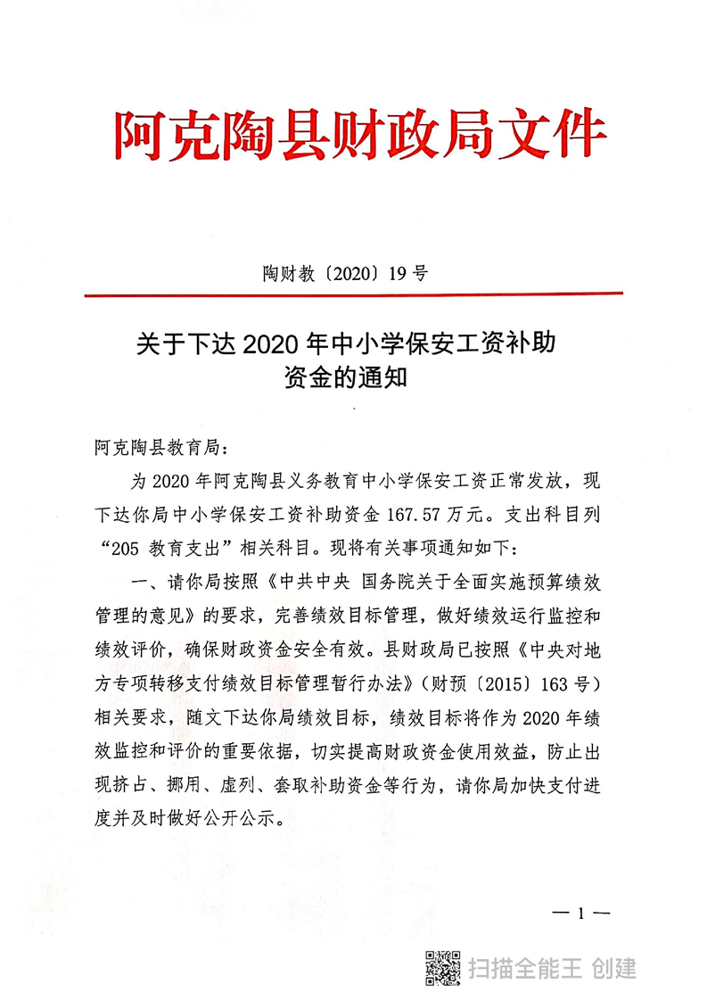 陶财教〔2020〕19号:关于下达2020年中小学保安工资补助资金的通知