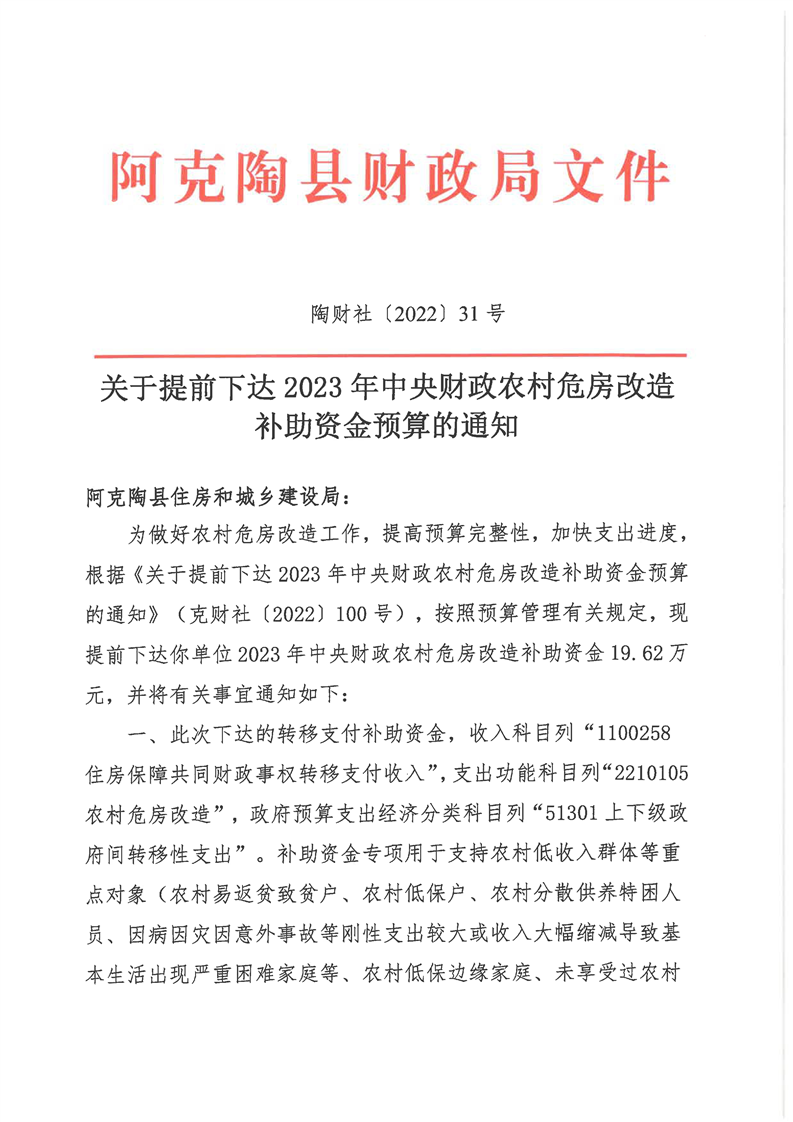 关于提前下达2023年中央财政农村危房改造补助资金预算的通知