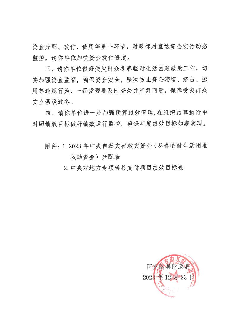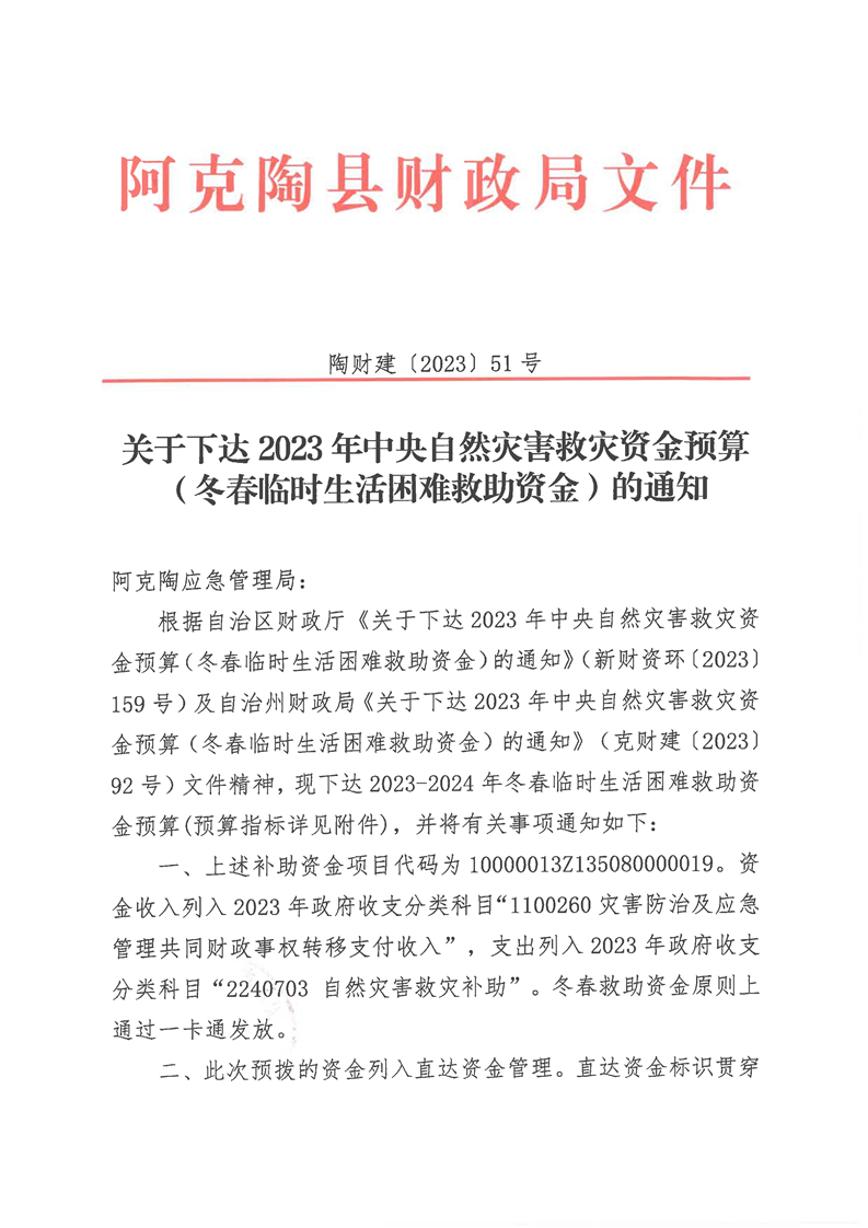 关于下达2023年中央自然灾害救灾资金预算(冬春临时生活困难救助资金)的通知