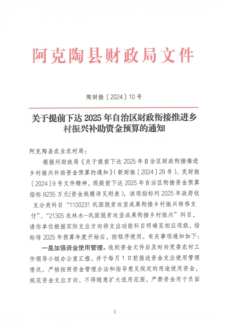 关于提前下达2025年自治区财政衔接推进乡村振兴补助资金预算的通知