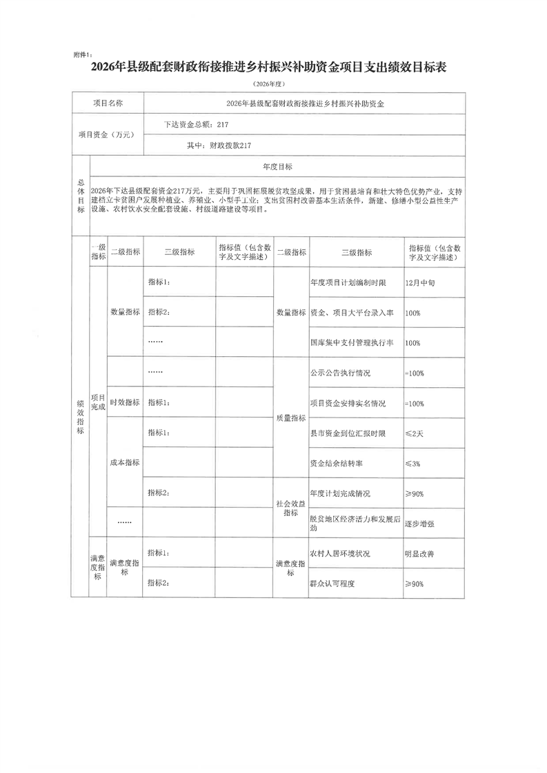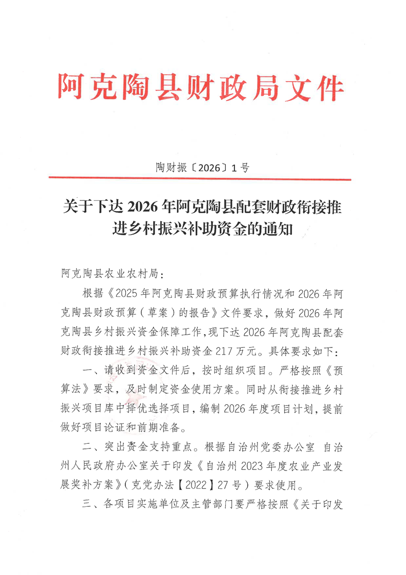 关于下达2026年阿克陶县配套财政衔接推进乡村振兴补助资金预算的通知