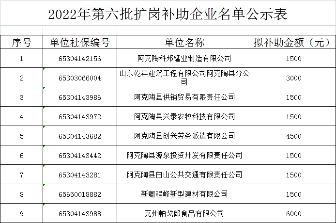 为认真贯彻落实自治区党委、人民政府有关决策部署,切实发挥失业保险助企扩岗作用,鼓励企业吸纳离校两年内的高校毕业生和登记失业青年,现将阿克陶县2022年第六批初审符合扩岗补助的阿克陶科邦锰业制造有限公司等9家企业吸纳就业15人情况进行公示。公示期5个工作日(2023年1月16日至2023年1月20日)。公示期内有异议的,请及时向阿克陶县人力资源和社会保障局反映。