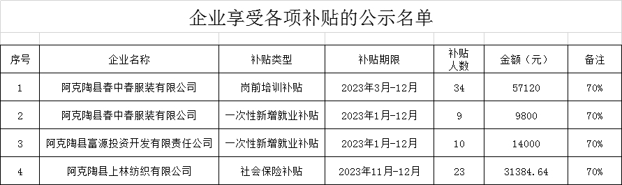 为进一步发挥各项就业补贴政策在减负、稳岗、促就业方面的作用,经审核,同意以下纺织服装企业各项补贴的申请。现将享受补贴的具体企业名单及补贴金额进行公示,公示期为7天(2024年4月16日-4月22日)。欢迎社会各界监督,接受实名举报。