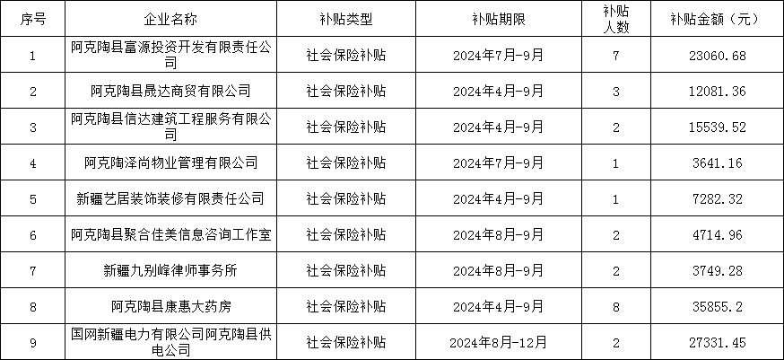 为进一步发挥各项就业补贴政策在减负、稳岗、促就业方面的作用,经审核,同意以下企业社会保险补贴申请。现将拟享受补贴的具体企业名单及补贴金额进行公示,公示期为7天(2025年1月2日-1月8日)。欢迎社会各界监督,接受实名举报。