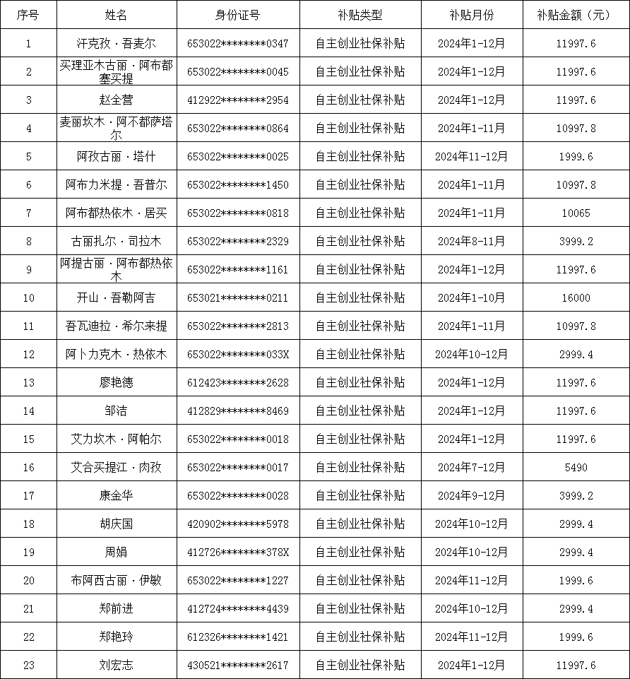 为进一步鼓励引导和支持创业,发挥就业资金效益,经审核,现将拟享受自主创业社保补贴的具体人员名单及补贴金额进行公示。公示期为7天(2025年1月17日-1月23日)。欢迎社会各界监督,接受实名举报。