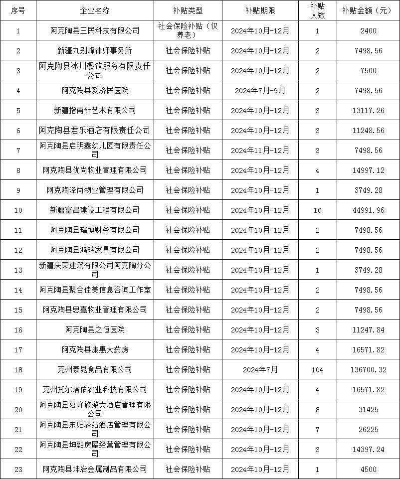为进一步发挥就业补贴政策在减负、稳岗、促就业方面的作用,经审核,同意以下企业社会保险补贴申请。现将拟享受补贴的具体企业名单及补贴金额进行公示,公示期为7天(2025年3月21日-3月27日)。欢迎社会各界监督,接受实名举报。