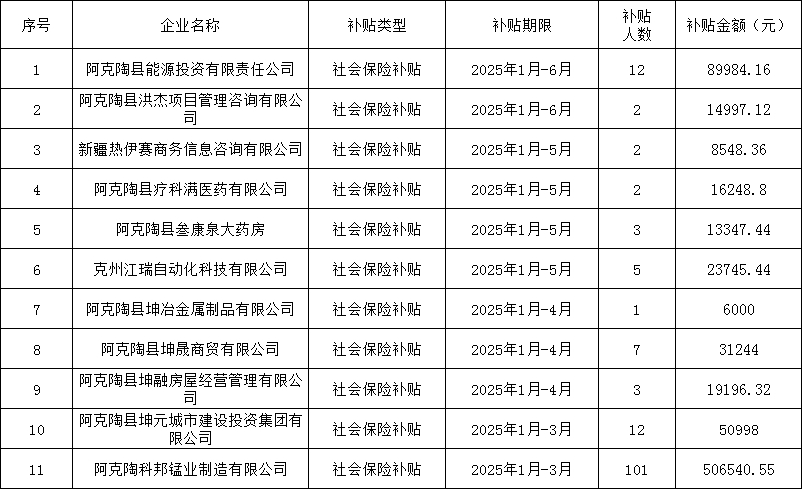 为进一步发挥就业补贴政策在减负、稳岗、促就业方面的作用,经审核,同意以下企业社会保险补贴申请。现将拟享受补贴的具体企业名单及补贴金额进行公示,公示期为7天(2025年7月28日-8月3日)。欢迎社会各界监督,接受实名举报。