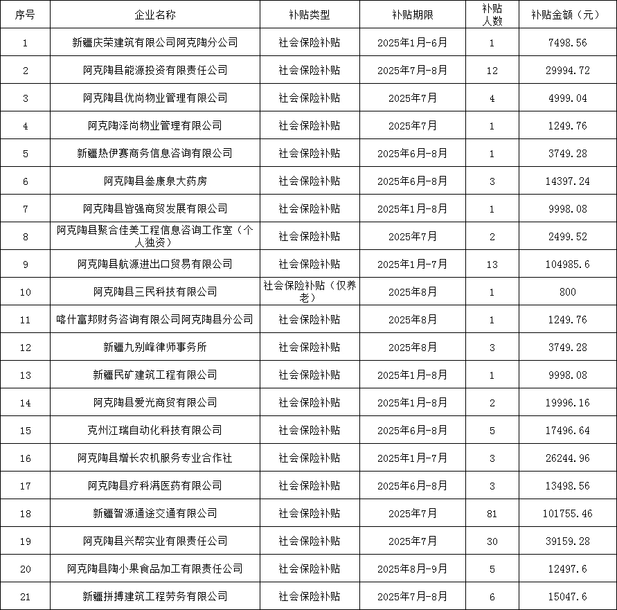为进一步发挥就业补贴政策在减负、稳岗、促就业方面的作用,经审核,同意以下企业社会保险补贴的申请。现将拟享受补贴的具体企业名单及补贴金额进行公示,公示期为7天(2025年10月17日-10月23日)。欢迎社会各界监督,接受实名举报。