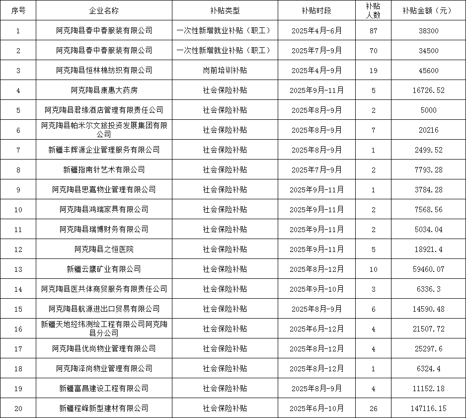 为进一步发挥就业补贴政策在减负、稳岗、促就业方面的作用,经审核,同意以下企业各项补贴申请。现将拟享受补贴的具体企业名单及补贴金额进行公示,公示期为7天(2026年1月9日-1月15日)。欢迎社会各界监督,接受实名举报。
