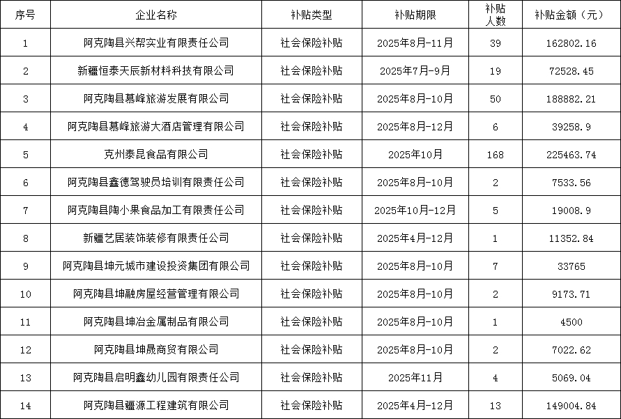 为进一步发挥就业补贴政策在减负、稳岗、促就业方面的作用,经审核,同意以下企业社会保险补贴的申请。现将拟享受补贴的具体企业名单及补贴金额进行公示,公示期为7天(2026年1月27日-2月2日)。欢迎社会各界监督,接受实名举报。