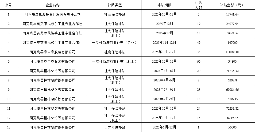 为进一步发挥就业补贴政策在减负、稳岗、促就业方面的作用,经审核,同意以下纺织服装企业补贴的申请。现将拟享受补贴的具体企业名单及补贴金额进行公示,公示期为7天(2026年2月24日-3月2日)。欢迎社会各界监督,接受实名举报。