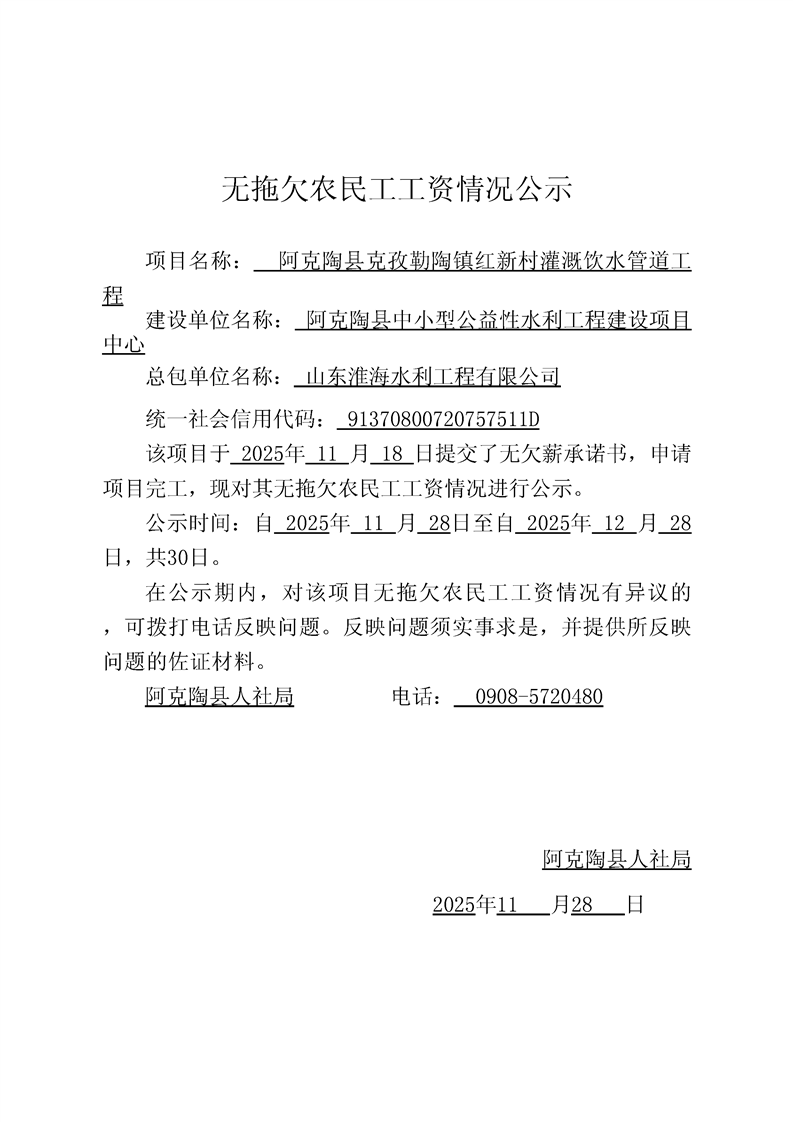 关于山东淮海水利工程有限公司阿克陶县克孜勒陶镇红新村灌溉饮水管道工程的完工公示