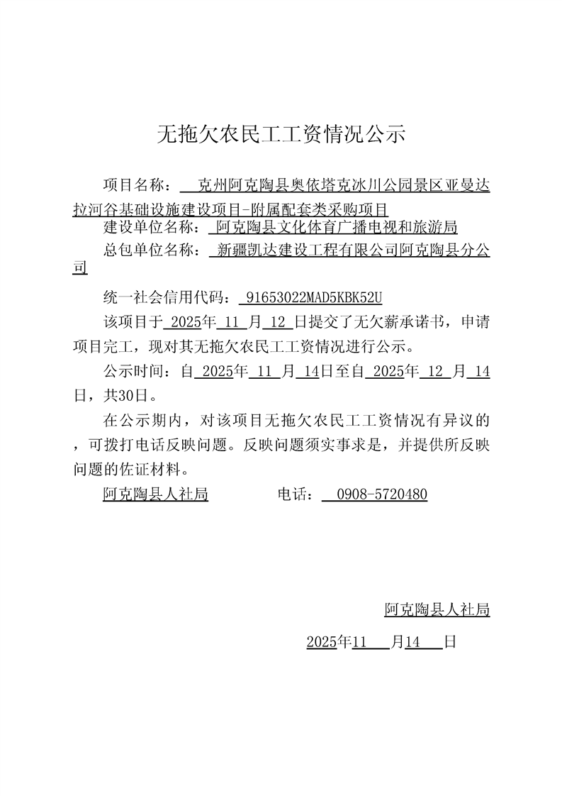 关于新疆凯达建设工程有限公司阿克陶县分公司克州阿克陶县奥依塔克冰川公园景区亚曼达拉河谷基础设施建设项目-附属配套类采购项目的完工公示