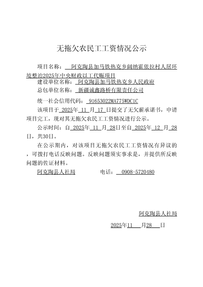 关于新疆诚鑫路桥有限责任公司阿克陶县加马铁热克乡阔纳霍依拉村人居环境整治2025年中央财政以工代赈项目的完工公示