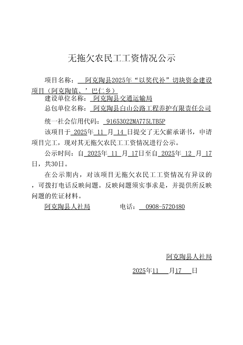 关于阿克陶县白山公路工程养护有限责任公司阿克陶县2025年“以奖代补”切块资金建设项目(阿克陶镇、巴仁乡)的完工公示