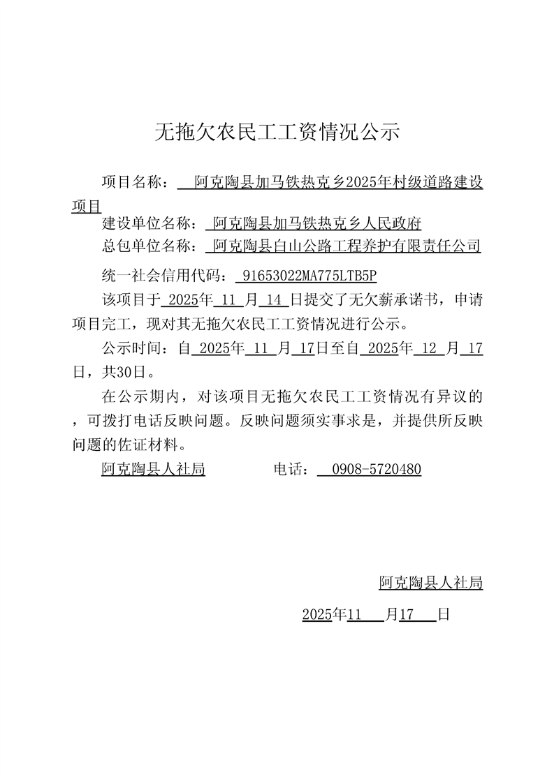 关于阿克陶县白山公路工程养护有限责任公司阿克陶县加马铁热克乡2025年村级道路建设项目的完工公示