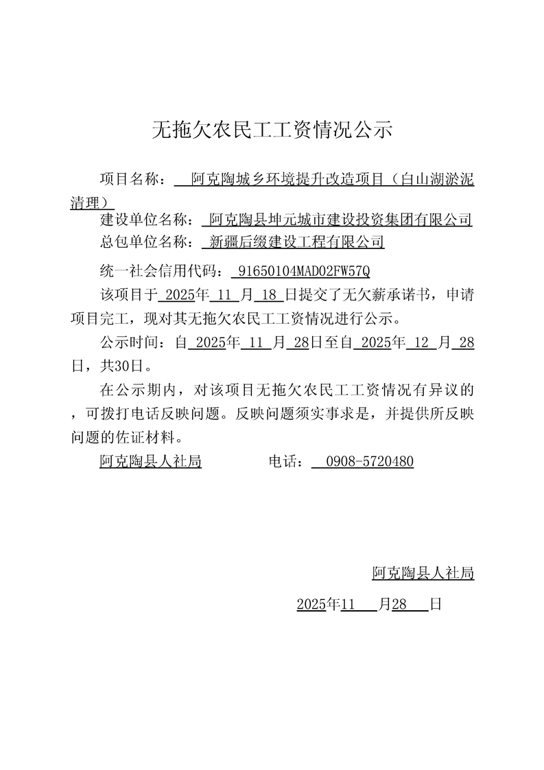关于新疆后缀建设工程有限公司阿克陶城乡环境提升改造项目(白山湖淤泥清理)的完工公示