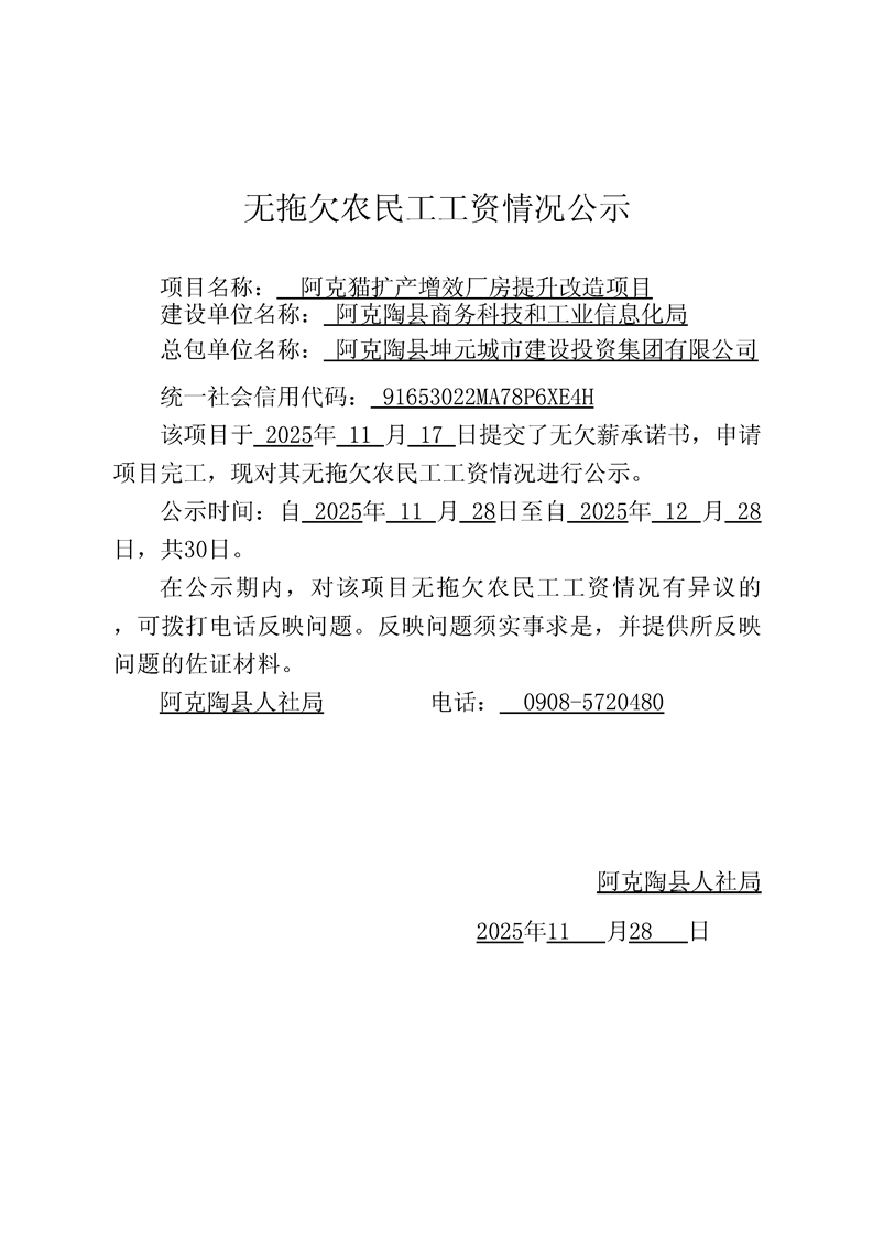 关于阿克陶县坤元城市建设投资集团有限公司阿克猫扩产增效厂房提升改造项目的完工公示