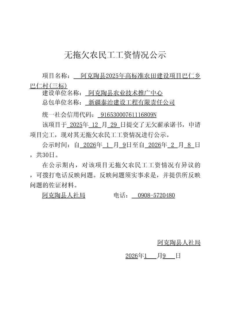 关于新疆泰治建设工程有限责任公司阿克陶县2025年高标准农田建设项目巴仁乡巴仁村(三标)的完工公示