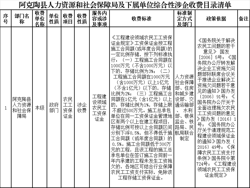 阿克陶县人力资源和社会保障局及下属单位综合性涉企收费目录清单