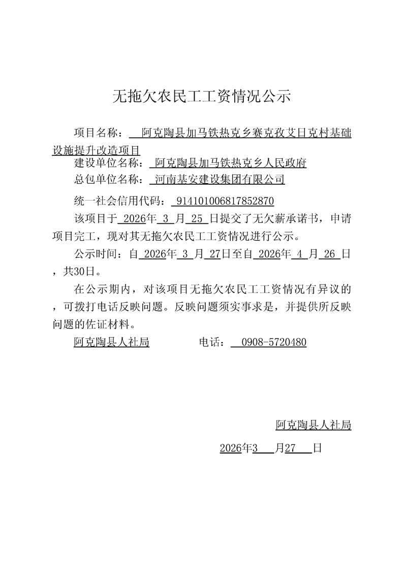 关于河南基安建设集团有限公司阿克陶县加马铁热克乡赛克孜艾日克村基础设施提升改造项目的完工公示