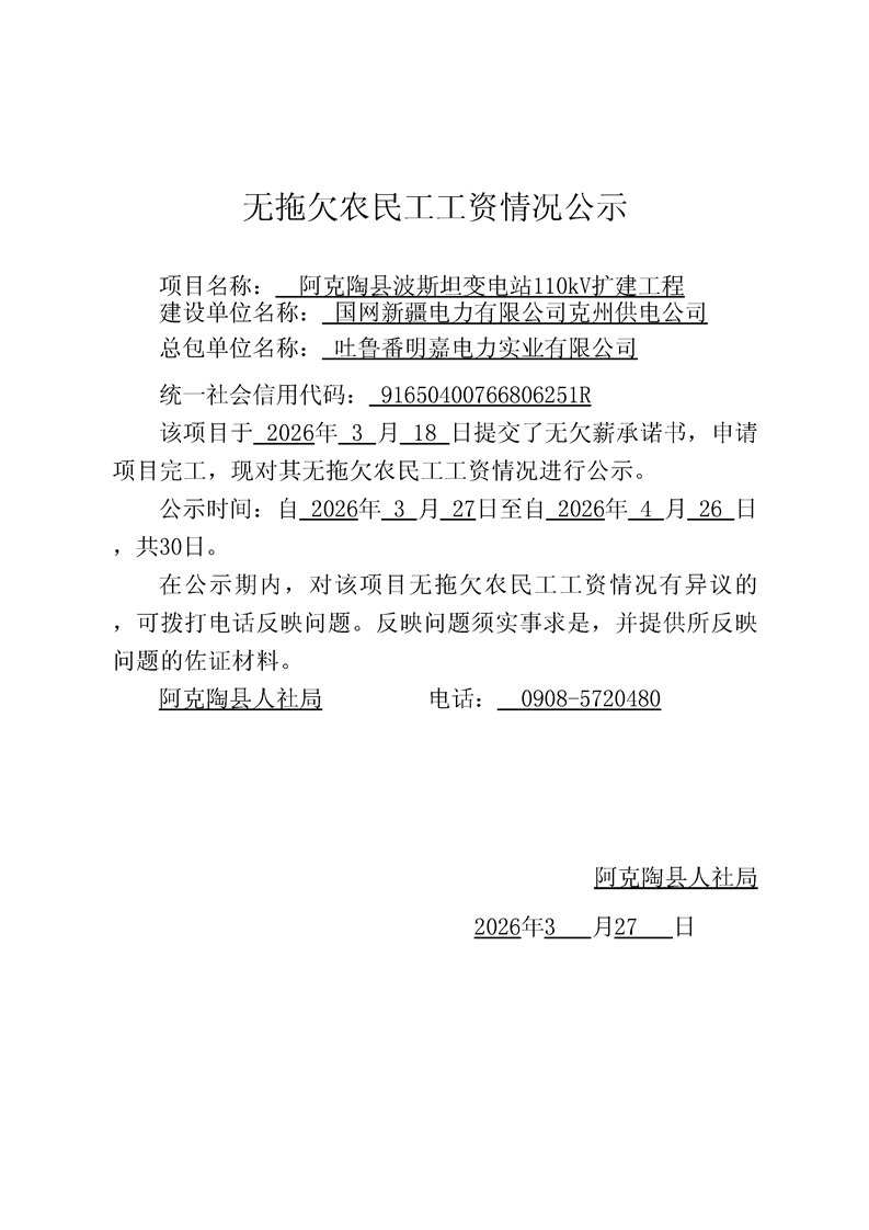 关于吐鲁番明嘉电力实业有限公司阿克陶县波斯坦变电站110kv扩建工程的完工公示