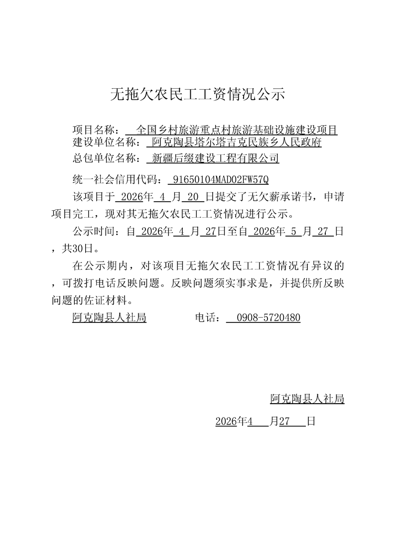 关于新疆后缀建设工程有限公司全国乡村旅游重点村旅游基础设施建设项目的完工公示