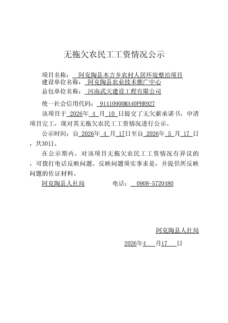 关于河南武天建设工程有限公司阿克陶县木吉乡农村人居环境整治项目的完工公示