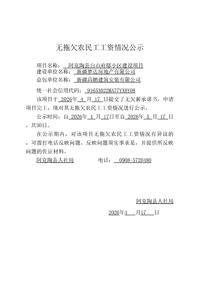 关于新疆昌鹏建筑安装有限公司阿克陶县白山府邸小区建设项目的完工公示