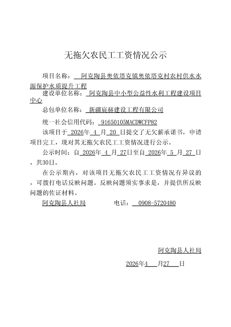 关于新疆宸赫建设工程有限公司阿克陶县奥依塔克镇奥依塔克村农村供水水源保护水质提升工程的完工公示