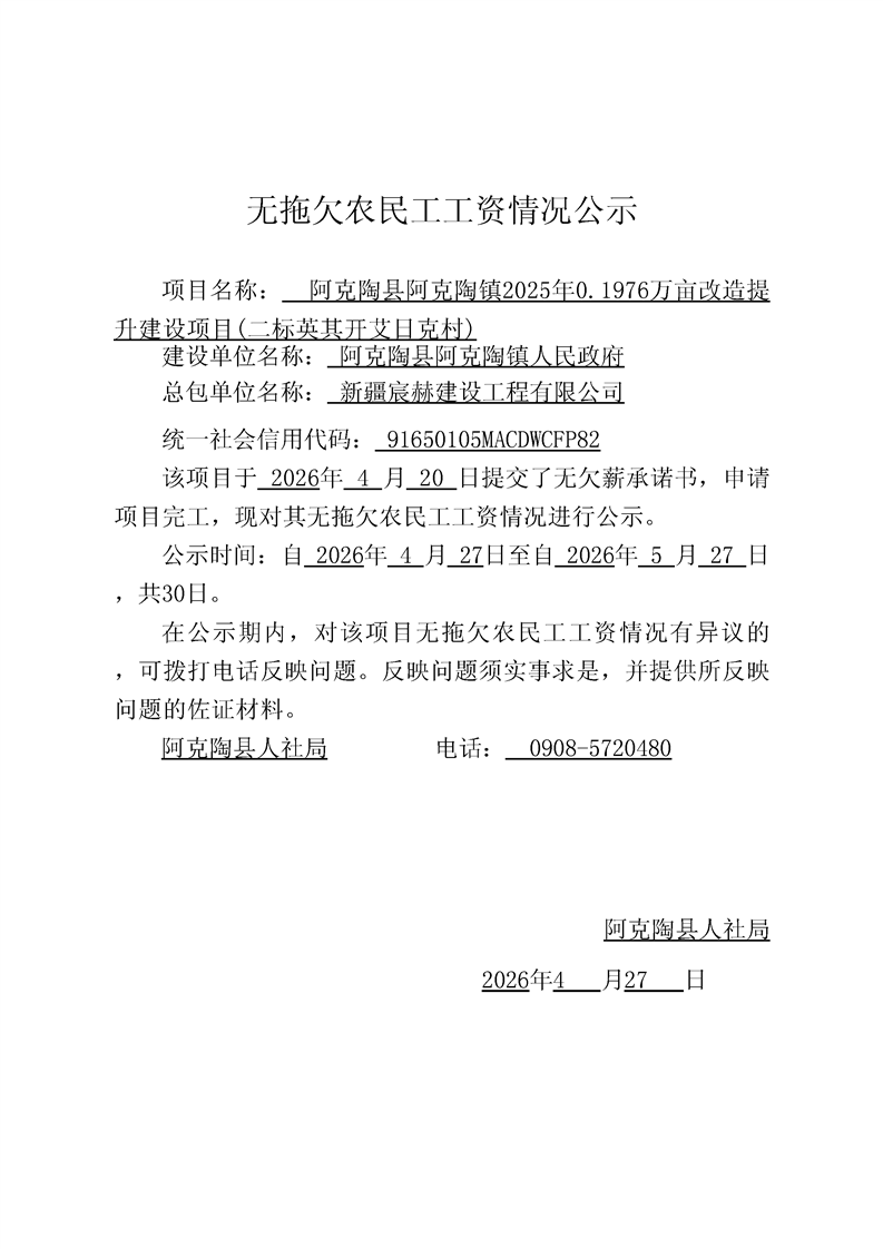 关于新疆宸赫建设工程有限公司阿克陶县阿克陶镇2025年0.1976万亩改造提升建设项目(二标英其开艾日克村)的完工公示