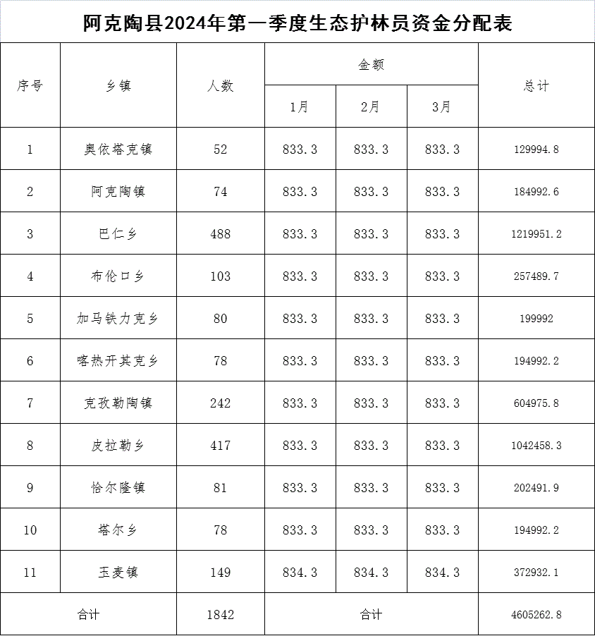 阿克陶县林业管理站将2024年第一季度生态护林员补助资金发放情况进行了公示,此次阿克陶县享受该补贴资金的人员共有1842人,补贴标准为每人每月833.3元,第一季度资金发放情况如下: