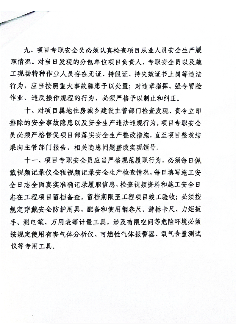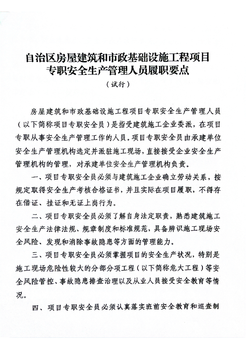 自治区房屋建筑市政工程项目专职安全生产管理人员履职要点试行的通知